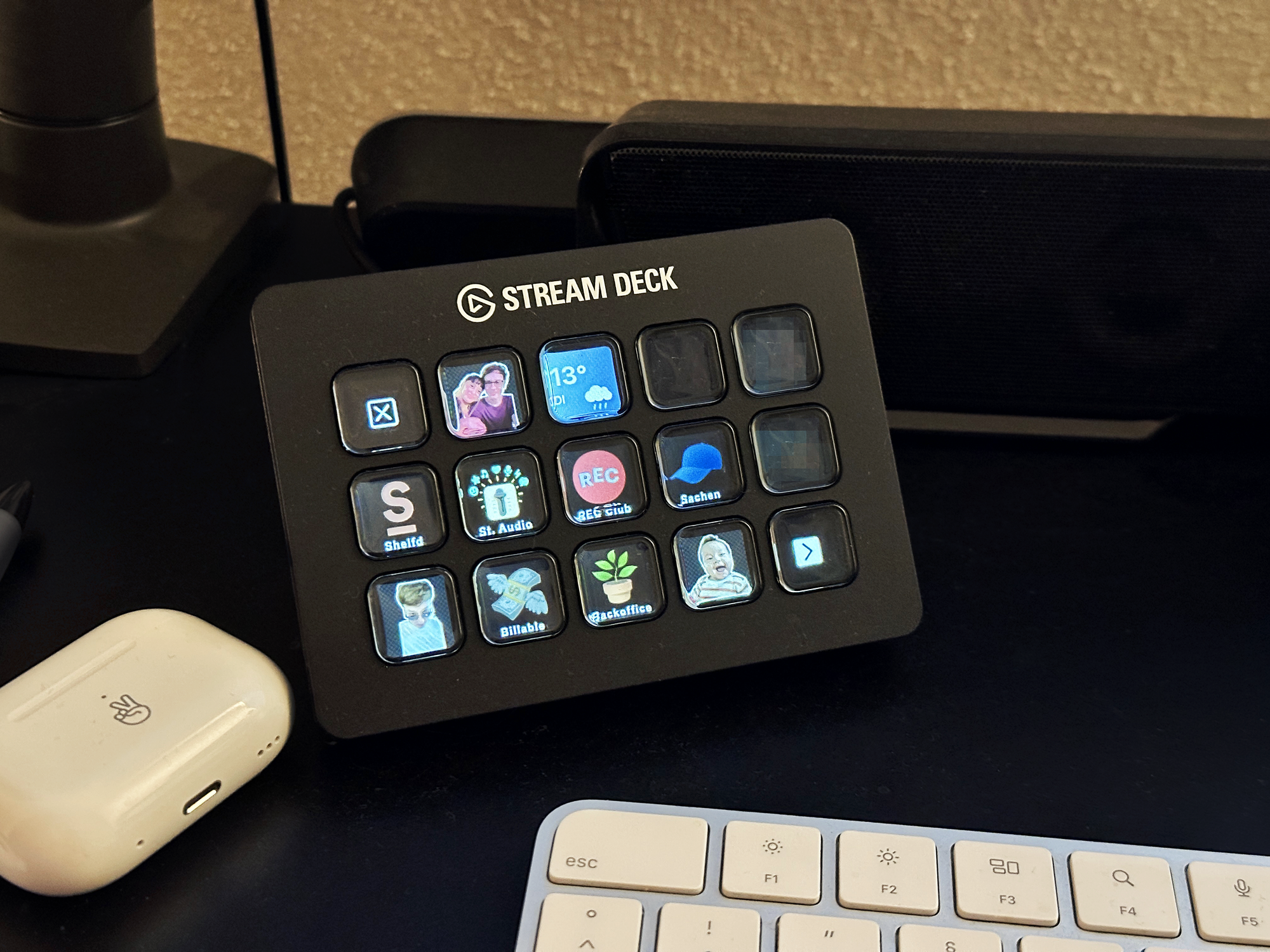Somit setze ich jetzt auch das kostenlose Tool Toggl Track* ein – und starte meine diversen Projekte mit der spaßigen Stream Deck Knopfmaschine* (Jenni's Video dazu). Auf dem kleinen Kasten auf meinem Schreibtisch strahlen mich meine Projektlogos an und daneben ein paar Sticker aus dem Familien-Chat, just for fun und ohne hinterlegte Logik.